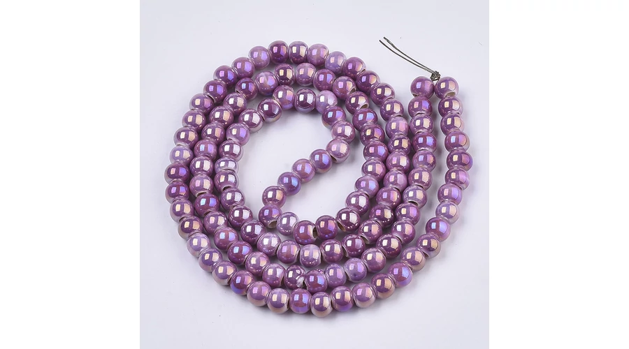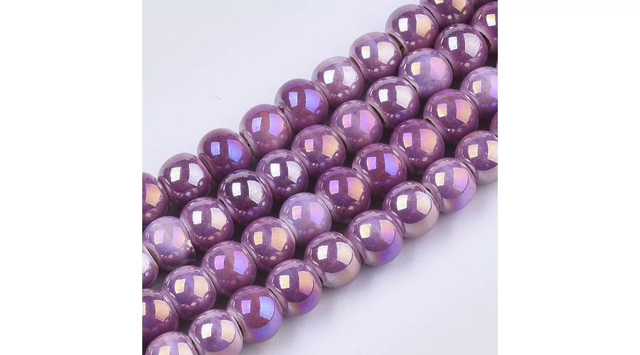 Porcelángyöngy, galvanizált, kézzel készített, fényes mázas, AB színű bevonat, kerek, rózsaszín, 7x6 mm (10db)